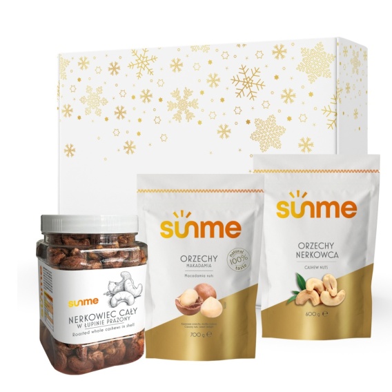 Opakowanie prezentowe świąteczne w białym połyskliwym wydaniu z delikatnym złotym nadrukiem gwiazdek śnieżynek oraz eleganckim logo SUNME to idealny sposób, aby podkreślić magiczną atmosferę świąt.